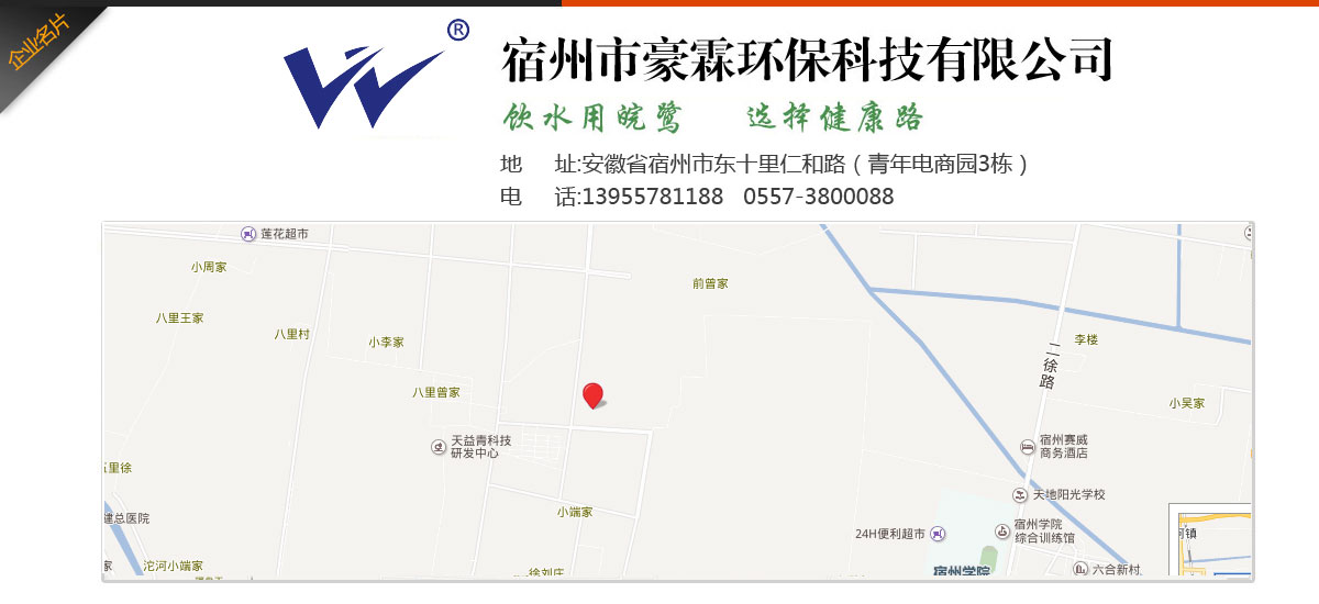 - 宿州市豪霖環(huán)保科技有限公司專業(yè)致力于水處理產(chǎn)品和系統(tǒng)水處理工程,集產(chǎn)品的開發(fā)與銷售、工程配套與安裝、技術(shù)咨詢與服務于一體的新型環(huán)保企業(yè)。主營產(chǎn)品:家用、商用純水機系列,能量活水機系列,家用、中央用凈水器系列,管線機,泵、膜系列,各種零配件、水處理耗材等配套產(chǎn)品系列,循環(huán)冷卻水處理系統(tǒng),鍋爐軟化水處理系統(tǒng),海水、苦咸水淡化、污水處理系統(tǒng),軟化及過濾裝備,紫外線及臭氧消毒設(shè)備等全部產(chǎn)品。